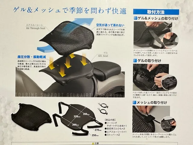 値段が少し高めですが、ゲルザブとメッシュシートカバーの一体感があることや、併用して使ってもシート高があまり気にならなかった点、メッシュシートカバーにも腰掛ける側に滑り止め加工がされているのでバイクのシートより滑らずに乗れるという点で、安心して使い続けられると感じました。